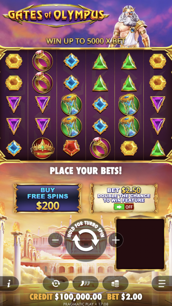 Gates of Olympus to popularny automat wideo od dostawcy Pragmatic Play, który przenosi graczy do świata mitologii starożytnej Grecji. Gra oferuje wysoki współczynnik RTP na poziomie 96,5%. Główną postacią jest potężny Zeus, gotowy nagradzać szczęśliwych graczy hojnymi mnożnikami i dużymi wygranymi.